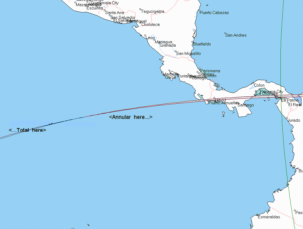 The eclipse is only total over the small area shown in the third map. No land-based observers will witness totality.